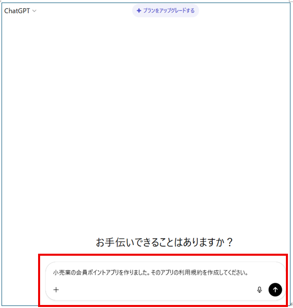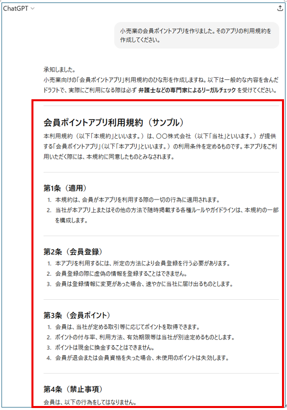 プロンプトに記載することで、精度の高い利用規約を作成することが出来ます。